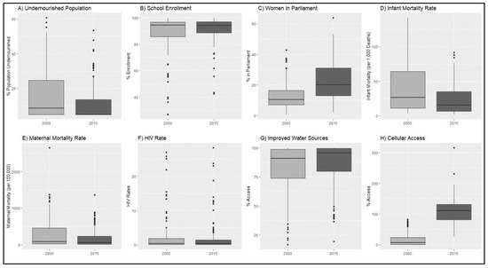 Figure 1 summarizes the average global values for each selected indicator between 2000 and 2015. Each indicator has improved during this time frame, but some more significantly than others. For example, the percentage of the population with mobile cellular access increased from an average of 16.77% to 108.19% in 15 years, showing a rise of more than 545%. Conversely, school enrollment levels increased from an average of 86.67% enrollment in 2000 to only 90.66% in 2015. The average infant mortality rate and maternal mortality rate decreased significantly. The average infant mortality rate decreased from 39.17 deaths per 1000 births in 2000 to 23.4 in 2015, and the average maternal mortality rate decreased from 270.85 deaths per 100,000 births in 2000 to 168.7 in 2015. These are all positive results, but each indicator had several outlying countries with significant improvements. For example, the maternal mortality rate for Sierra Leonne was 1360 deaths per 100,000 births in 2015, while this value was 3 for Poland in the same year, indicating a need for a continued effort to improve on the indicator.