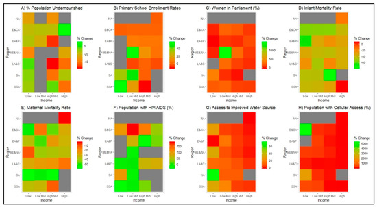 Percentage change for eight development indicators across seven world regions and four income categories before and after the 15-year implementation period (2000–2015) of the MDGs. North America (NA), Europe & Central Asia (E&CA), East Asia & Pacific (EA&P), Middle Eastern & North Africa (ME&NA), Latin America & Caribbean (LA&C), South Asia (SA), and Sub-Saharan Africa (SSA). To estimate the percentage changes, we used only those countries for which data were available both in 2000 and 2015. Green color indicates the regions and income groups with the highest improvements while red indicates those with the lowest improvements. The grey color indicates the lack of data to calculate the percentage change for an income group in a specific region.