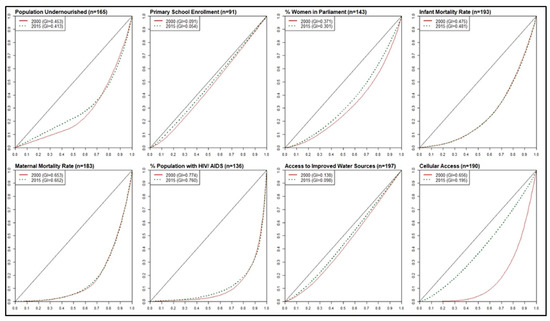 We estimated the LC and calculated the GI for the years 2000 and 2015 to ascertain any changes in inequality among countries for each selected development indicator. Many studies have applied these calculations to address levels of inequality in different disciplines (Yang et al. 2019; Chowdhury et al. 2018; Alinia et al. 2018; Malakar et al. 2018; Saez et al. 2018; Stensrud and Valberg 2017). In this study, we use the cumulative percentage of a given indicator for each country to derive a global GI. For example, to ascertain the cumulative percentage of the infant mortality rate at the global level, we added up the values for each country, which were more than 7500 in 2000 and 4500 in 2015. Then the countries were sorted from the lowest rates to highest, and the cumulative percentage of infant mortality was found by adding up a country’s mortality rate with the rates of all previous countries and dividing by the total world mortality rates. Therefore, the y-axis in the LC would represent the cumulative percentage of the mortality rate, with the countryy=1 being the country with the highest infant mortality rate and the countryy=0 being the country with the lowest infant mortality rate.