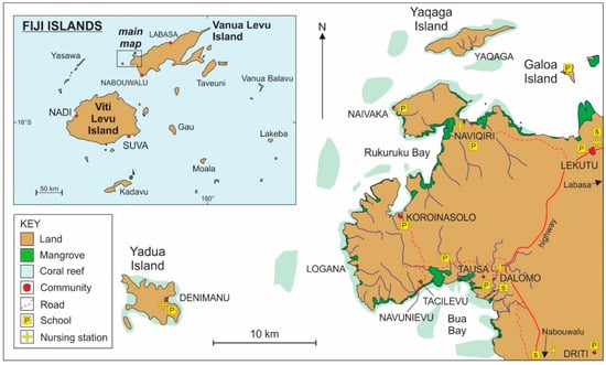 The study area in western Vanua Levu Island falls wholly within the province of Bua (Figure 1), which is governed at subnational level by the District Office that falls under the Commissioner Northern’s Office. Dominated by iTaukei people (79% in 2007 Census), much effective control on development in Bua is exercised by the Bua Provincial Council and traditionally through the chiefly hierarchy. Whether on the main island or a smaller one, most people in Bua live along its coasts and subsist at least in part from foods that they produce or acquire from their own land as well as nearshore (ocean) areas; coral-reef and mangrove ecosystems are key to most subsistence livelihoods. The Labasa-Nabouwalu highway—the only sealed road on Vanua Levu Island—runs through Bua. There is a full-service hospital in Labasa, a sub-divisional hospital in Nabouwalu, and a scatter of ‘nursing stations’ with a resident medical professional.