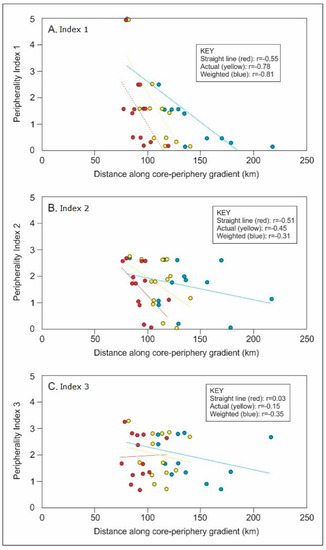 5.1. Relating Indices A–C to Distance along Core–Periphery Gradient