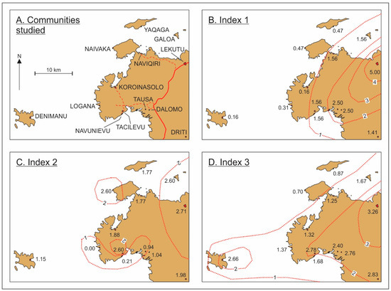 Mapping of Index 2 gives a far less uniform picture (Figure 3C) that is superficially difficult to interpret, largely because of apparently anomalously high values for Naivaka and Tacilevu, something emanating from their comparatively large proportion of younger compared to elderly people. There may be many reasons for such situations, including those where life span is comparatively low. Similarly, Index 2 for many apparently more peripheral communities (like Denimanu, Driti, Koroinasolo, Naviqiri and Yaqaga) is higher than for others (like Dalomo, Logana, Navunievu and Tausa) that might be expected to have higher values. In most instances, this appears to be largely a function of community size, demonstrating that many apparently more isolated communities may in fact have quite large populations, perhaps representing community coherence (or a low desire to move out), a high proportion of returnees from living elsewhere, or even—as is the case for Denimanu, Driti and Yaqaga—the possibility of earning better wages (from fishing or kava growing) in the village than through employment in urban centres.