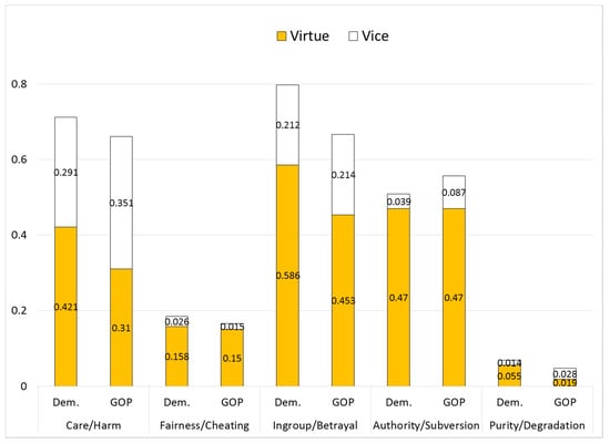 Fourth, however, additional partisan differences appear if positive-valence (virtue) words are distinguished from negative-valence (vice) words within each foundation. As the top part of each bar in Figure 1 shows, the Republicans used the vice dimension of four of the five foundations more frequently than Democrats. Moreover, in four of five cases Democrats used more virtue words (with a tie in the fifth, Authority). If the total usage of virtue words and of vice words is summed across all five moral foundations, the partisan differences are significant for the combined total for virtue (Democrats 1.69%, Republicans 1.40%, p = 0.001), while differences appear but do not reach standard levels of statistical significance for vice (Democrats 0.58%, Republicans 0.69%, p = 0.11).