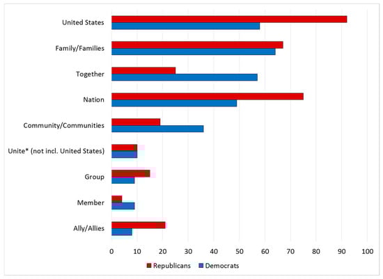 The significant Democratic advantage in the use of Ingroup-Virtue words, surprising given the expectations of MFT, merits closer examination. To investigate how candidates of each party used these loyalty-oriented words, the text of every segment containing at least two such words was gathered, yielding a similar number of segments for each party (106 Republican, 100 Democratic). Figure 2 shows the most frequently used Ingroup-Virtue words in these segments by party. The Republican candidates, consistent with a nationalistic orientation, were more inclined to mention the United States (united is an Ingroup word) as well as the word nation. Democrats, on the other hand, were more likely to talk about community or communities and to use the adverb together. In general, many Ingroup-Virtue words in the Moral Foundation Dictionary seem quite consistent with a social and political philosophy that stresses communitarian or mutualistic obligations (e.g., collective and solidarity, although those words were not much used in the debates). These sentiments are reflected in the proverb, “It takes a village to raise a child,” which formed the basis for the title of a book by then-First Lady Hillary Clinton (1996), and in her 2016 campaign slogan “Stronger Together.”