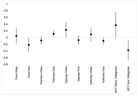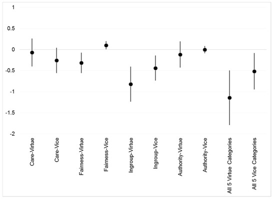 The estimated marginal effect of Donald Trump as speaker (relative to non-Trump Republican candidates) on the number of moral-foundations words used per segment. Dot represents point estimate and bar represents 95% confidence interval. The All 5 Virtue and All 5 Vice categories sum together the counts for all five moral foundations, including Purity.