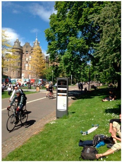 Cyclists and pedestrians utilizing the Middle Meadows Walk. Note the designated cycle lane and bicycle counter (Photo by G.L. Buckley, June 2016).