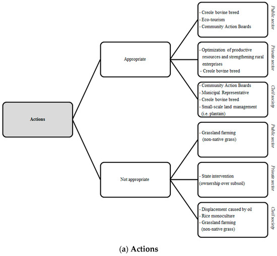 The results of social norms are divided into two key aspects: (1) actions, what ought to be appropriate and what is not; and (2) sanctions, both positive and negative. Both are based on tradition as well as formal, informal and customary rules. The results presented in Figure 2a,b, suggest that the most appropriate actions embedded in the CL are to maintain and preserve the creole bovine breed of the Llanos region and to rely on Community Action Boards, CAB (also known as juntas de acción comunal). The least appropriate actions to take are the grassland farming activities to replace native grass for an improved productivity. Regarding the role of positive sanctions, what emerges is that the lack of requirement and infrastructures to export meat abroad favors the relevance of regional and national markets. Nonetheless, the role of central and regional institutions (e.g., corruption) is perceived as a constraint for the protection of the CL. The logic of Figure 2 is to present the connection of appropriate actions versus non appropriate actions. Correspondingly, we wanted to visualize the connection of positive and negative sanctions.