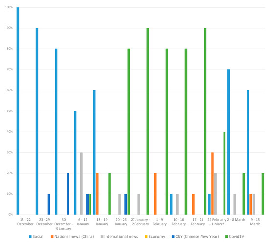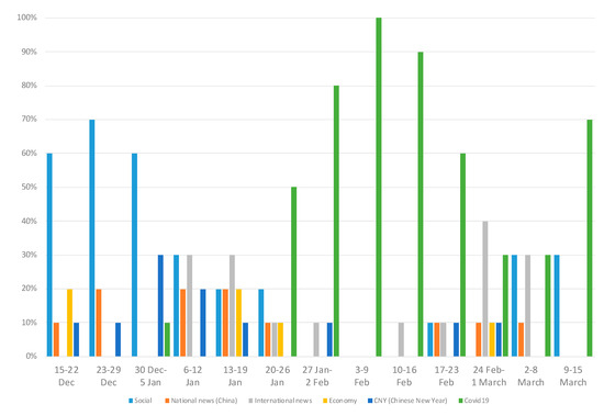 During the first period of analysis (Figure 2), 90% of the topics posted on Weibo were dedicated to social news regarding the lives of leading films stars and local celebrities. One of the most frequently posted topics was the sudden death of a famous Chinese film actor, Gao Yixiang on the set of a TV series he was shooting. The resulting 10% of topics posted during this period were dedicated to Chinese New Year preparations, which would be celebrated on the 25th of January. At this early stage, there was no mention of COVID-19.