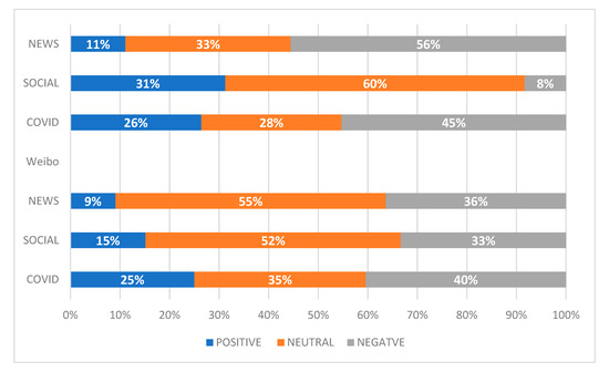 - During the period of investigation, the results indicated a higher percentage of positive sentiment topics related to COVID in comparison to topics of general news orientation, for both Baidu and Weibo.