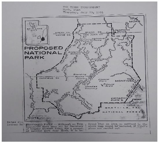 - Holtby, Travis. 2012. Outdoor Industry Proposed Supersized Canyonlands. Moab Sun News. Available online: www.moabsunnews.com/news/article (accessed on 9 June 2020).