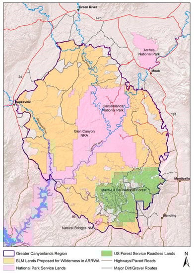 - Southern Utah Wilderness Alliance. 2018. Protecting Our Canyonlands. Available online: https://suwa.org/issues/canyonlands/ (accessed on 10 June 2020).