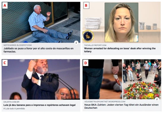 The choice of headlines was random in order to show examples of false and outrageous titles that exist and are verified by fact-checkers. Figure 1 shows four fake stories in different countries: in Spain (Figure 1A), in the United States (Figure 1B), in Brazil (Figure 1C) and in Germany (Figure 1D). All headlines were checked by the fact-checkers in their countries. In addition to being fake, they all have exaggeration, sensationalism and even violence in common. Figure 1A appeals to the emotional part of the reader, stating that an elderly person is crying for not having money to buy protective masks for the COVID-19 pandemic. The image was manipulated and taken out of context2. In Figure 1B, the fake story is unusual, outrageous and impressive3. In Figure 1C, the subject criticizes the press for allowing an offensive gesture by former President Lula da Silva, claiming that he bribed the press4. In Figure 1D, fake news explores the controversial issue of refugees, blaming them as perpetrators of crimes. The image is shocking and violent5.