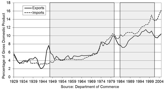 The selection of the 1947–1981 and 1984–2001 periods was dictated by the availability of data. (For some of our models, we have data only back to 1964). Fortunately, this is an informative time in which to consider the effects of trade. Figure 1 shows the role of trade in the American economy since 1929. During the period we will consider, which is shaded in the graph, the American economy moved from a long period of relative autarky to one of much greater trade openness. Trade, as a percentage of gross domestic product (GDP), did not really break out of the low levels seen during the Great Depression until the mid-1960s. Both exports and imports roughly doubled as a percentage of GDP between the mid-1960s and 1980. The period since 1984 has seen further increases in imports, though exports have not risen as quickly. The effects of this trade liberalization process were not uniform across the United States. Differences in its effects across the 50 states as well as over time provide us with considerable explanatory leverage in estimating the impact of trade liberalization on union density and strikes.