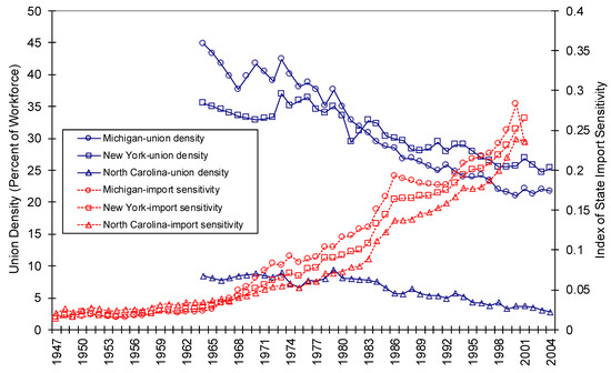 Union Density and Import Competition in Three States, 1947–2004.