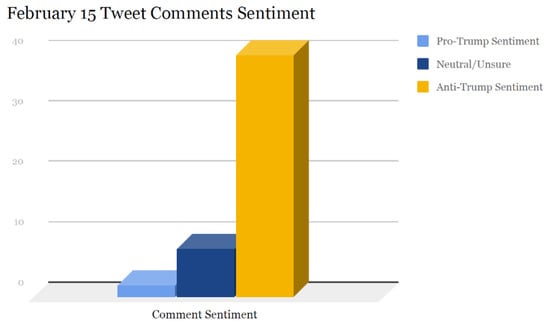 Of the two comments coded for positive sentiment, one reflected common themes carrying over from the election: “Great job, Mr. President!! Please get a special prosecutor to get the Clinton Foundation as promised! #Lockherup #MAGA” (@allurephoto, 16 February 2017). The other comment conveyed a mixed message, where the user showed support for Trump, but expressed exasperation at a lack of action: “It’s time to do something about it! Enough talk! Find the guy/gal who has the guts to do it! Too much talk not enough action. I am 100% in POTUS corner but it’s time. Past time” (@lkw72258, 24 February 2017).