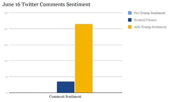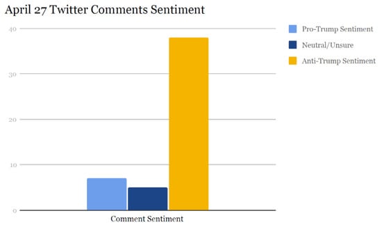 Finally, this study analyzed the first 50 comments listed for the tweet by @realDonaldTrump posted on 7 May 2018 insisting that Trump never colluded with Russia, nor obstructed the Russia Investigation. “The Russia Witch Hunt is rapidly losing credibility. House Intelligence Committee found No Collusion, Coordination or anything else with Russia. So now the Probe says OK, what else is there? How about Obstruction for a made up, phony crime. There is no O, it’s called Fighting Back” (Trump 2018b). In this tweet, ‘O’ signifies obstruction of justice. The tweet received more than 25,000 replies. Of the 50 coded comments, Figure 4 displays 43 replies classified as Anti-Trump sentiment, 4 as Pro-Trump sentiment, and 3 as Neutral/Unsure.
