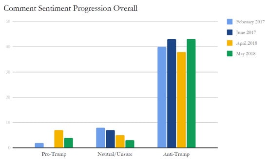 On 18 April 2018, Trump tweeted that the Republican House Committee adjourned their investigation and did not find President Trump guilty of any wrongdoing. Not surprisingly, this subgroup displayed the highest proportion of Pro-Trump sentiment (14%). However, 76% of the subgroup comments still exhibited Anti-Trump sentiment. The comments’ themes illustrated profound distrust of the Republican party, Ted Nunes (leader of the investigation), and thus, the fairness of the investigation. Many of the audience’s comments suggested that FBI agent Mueller has enough evidence to charge Trump with ‘collusion,’ and that Mueller’s investigation is more legitimate than the House Committee’s.