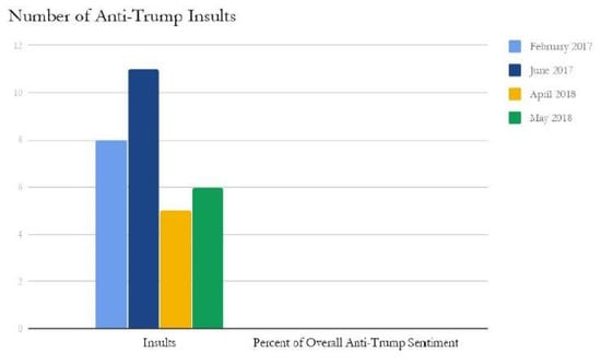 Eighty-six percent, or 43 of the 50 replies of the June sample subgroup contained Anti-Trump sentiment. Of these, 32 replies contained general criticism, and 11 contained offensive language targeting Trump himself. Of the four sample groups, this one contained the highest number of units labelled ‘insult’.