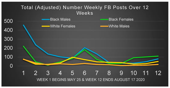 White males were least supportive of BLM (26% made comments critical of BLM, coded as pro-status quo). This percentage was much higher than for White females (7%). While Black males were only a small proportion of all of the subject’s FB friends (7%), they accounted for a far greater proportion of all of the comments on the subject’s FB feed (21%) (see Table 1). This finding is also depicted in chart form to show the adjusted number of FB posts over a 12-week period by Black males, as well as the other three demographic groups (see Figure 1).