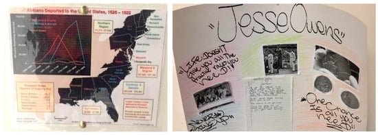 As such, throughout the observations, Mr. Brown engaged the students in a range of learning activities that included a cultural component. For example, Figure 1 displays images of students’ project-based learning history projects that were posted throughout Mr. Brown’s classroom. For one activity, students developed timelines that traced the deportation of African slaves to the U.S. Additionally, during the 2016 summer Olympic games, Mr. Brown had students develop poster board-sized profiles of prominent racial/ethnic minoritized gold medalists who participated in the 1936 Olympic games, such as Jesse Owens.