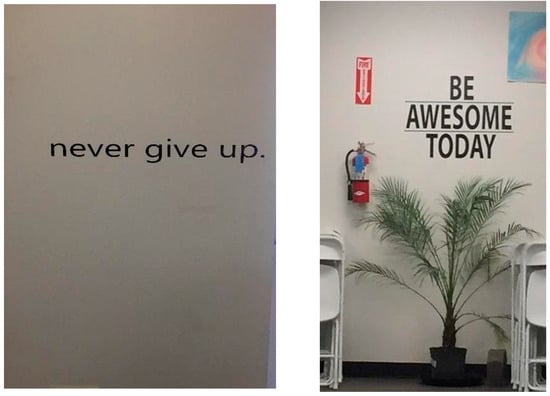 This “choice culture” also helped to increase opportunities for academic instructors to communicate messages of high expectations. Specifically, throughout the study period, instructors and other school personnel frequently spoke encouraging and affirming messages, such as “you can do this,” to students who were struggling with a particular assignment or activity. These positive messages were also displayed throughout the physical environment of the school, wherein the walls in classrooms and throughout the common areas of the school were covered in various phrases and quotes such as, “never give up,” “Be Awesome Today,” and “In order to succeed we must first believe that we can” (see Figure 2).
