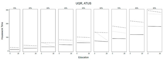 Figure 2 and Figure 3 summarise the estimates of the UQR models for the US and Japan. The solid lines indicate non-married women, the dotted lines indicate married women without children, and the dashed lines refer to married women with children’s association between education and housework time. Although Figure 1 showed that the association in the US is more negative, and the association in Japan is more positive, the predicted housework time by education years in both countries appears flatter, especially in Japan. There is a more explicit negative association between education and housework participation mostly among married American women, who are in the upper deciles of housework participation (see Figure 2).