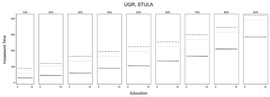 UQR Predicted Housework Time by Education over Deciles of Housework Participation, Japan.