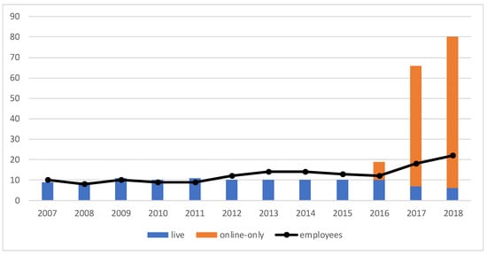 In terms of employees, before the move to online-only auctions, CML rose from a minimum of eight full-time employees in 2008 to a maximum of 14 employees in 2013 and 2014 (Figure 7). These numbers grew significantly when online auctions became much more relevant: 18 full-time employees in 2017, and 22 in 2018: “In a certain way, we changed printing costs, nearly EUR 30,000 to EUR 40,000 per catalogue, of which we are making four or five less per year, for costs with salaries, hiring more people and increasing these costs in nearly EUR 300,000 per year” (INT04). Concerning part-time employees, consultants and trainees, CML evolved from a minimum of ten people in 2008 to a maximum of 25 in 2015 and 2018, although in 2011, 2012 and 2014 CML already had a high number of collaborators with these characteristics, counting with 22 people.