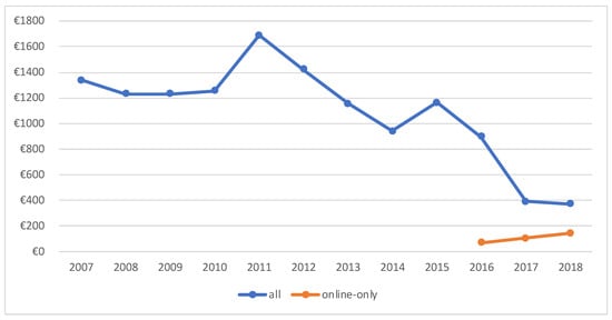 Considering the average lot price, the quantity of lots taken to auction per year, and the number of auctions conducted yearly, we understand how and why this company needed to change its business model. Between 2007 and 2015, the number of lots that CML took to auction varied between a minimum of 6.204 lots, in 2008, and a maximum of 10.236 lots, in 2014. After having introduced exclusively online auctions in the last quarter of 2016, these numbers rose to 11.213, in 2016, 18.418, in 2017, and 24.017, in 2018. Before the introduction of online auctions, the average price varied between a maximum of EUR 1.689 in 2011 and a minimum of EUR 934 in 2014 (Figure 8). After the beginning of online auctions, these values have been diminishing year after year: EUR 898 in 2016, EUR 392 in 2017, and EUR 370 in 2018. However, if we center our attention only on the average price of lots sold online, the tendency is more promising: EUR 67 in 2016, EUR 103 in 2017 and EUR 143 in 2018.