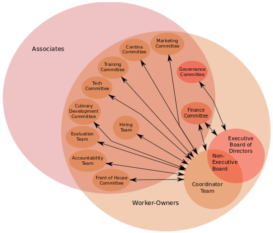 The Casa Nueva restaurant (which is Mexican) in Athens, Ohio, USA has survived for more than thirty years (Dastur 2012, p. 17). More specifically, the Casa Nueva website (Casa Nueva n.d.a) indicates: “We are very proud to have been a provider of local, sustainable, Mexican-inspired food for our community for the last 30+ years!” Flexibility on ownership and management structure (see Figure 1) and requirements is also recognized at the coop level. For example, Casa Nueva restaurant declares that their “success as a cooperative rests firmly on our ability to adapt these [other cooperatives] models to the goals and needs of the business and the individual co-op members.” (Casa Nueva n.d.b). At Casa Nueva, every worker has a voice, is listened to, and also accorded due respect; worker-owners have the prerogative to vote, as every worker-owner has one non-transferable share of the business that accords them one vote, and people are accountable for the decisions they make (Casa Nueva n.d.b). Figure 1 shows the management structure of the Casa Nueva restaurant.