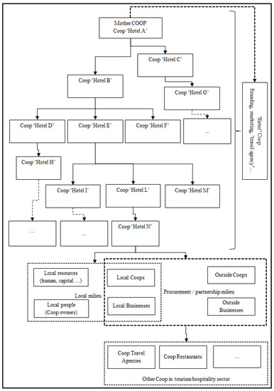 While the initial mother coop (Coop ‘A’) may be based on a specific location, its network can be locally based and may also be spread in other geographical areas. This implies that any coop hotel can become a mother coop of other coop hotels. Specific links need to be established with other coops in the tourism and hospitality sectors to try to increase the weight and control of the sector itself.