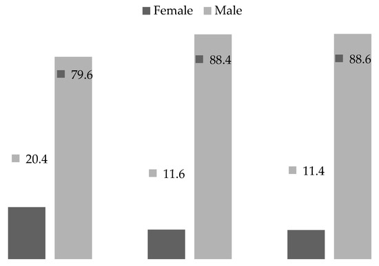 Thus, it can be seen that those who solely hold the position of manager (245 members) are 79.59% male and only 20.41% female. The number of members who have the sole position of director is much lower (95), and the female percentage of directors is also lower, constituting only 11.58% of the population, while their male counterpart accounts for 88.42%. This is repeated again in the case of those who have dual roles as directors and managers, where 11.39% are female, and 88.61% are male. Therefore, for all three positions, females are underrepresented. This imbalance between both sexes has been previously studied in organizations (Wharton and Baron 1987) and companies present in the Stock Market (Rodríguez-Domínguez et al. 2012).