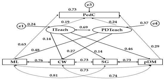 Further, strong associations are seen between the variables describing management leadership, collaborative working, shared goals and participation in decision making, with obtained values varying between 0.73 and 0.81. In addition, Figure 1 shows a moderate association between management leadership and pedagogical coordination, with a value of 0.63 being obtained. The leadership exercised by management was also found to impact upon the professional development of teachers, with a value of 0.37 being obtained. The collaborative work dimension was found to lightly influence the involvement of teaching staff dimension (0.14) and moderately influence the professional development of teachers dimension (0.48). The variable describing shared goals was found to weakly impact on the involvement of the teaching staff (0.27). With respect to the factor describing participation in decision making, moderate influences were observed on both the involvement of teaching staff (0.46) and on the variable describing pedagogical coordination (0.37). Finally, the involvement of teaching staff variable revealed a moderate-to-strong impact upon the professional development of teachers variable, with a value of 0.69 being produced. As can be seen, the developed model outlines positive and significant (p < 0.05) associations between all of the included variables.