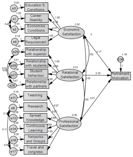 The model intends to estimate the effects of the dimensions economic satisfaction, professional satisfaction, and relational satisfaction on the motivation to retire. The model is composed by three latent variables and one exogenous one named Overall satisfaction. The model assumes that the three dimensions cited explain satisfaction, which are related, and predict the motivation to retire. Next, the factors that affected the relational and professional satisfaction, which had the greatest weight in model 1, will be examined, as related to the intention of the active professors for retiring (model 2), as well as the motivation possessed by the nonactive professors (model 3).