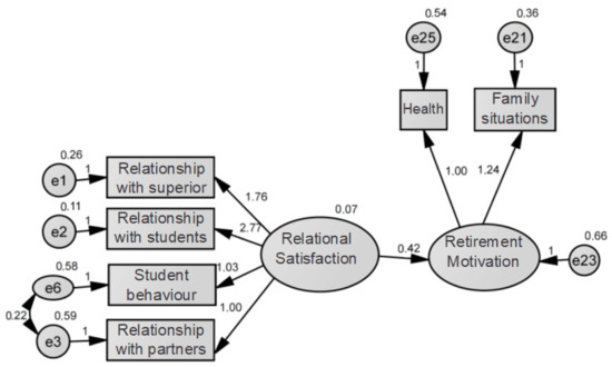Path diagram of model 3: influence on the relational satisfaction on the motivation to retire of nonactive professors.