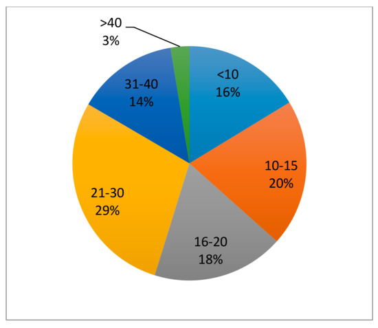 The professors in the sample taught within every area of knowledge. Of note, 39.6% were Social and Legal Sciences professors (see Figure 7). The professional category of 41% of them was Full Professor. Also, 28.6% had between 21 and 30 years of experience (see Figure 8), 97% were active, and 3% retired.