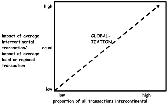 Goods and services consumed by people have always come from a combination of local, nearby, and distant sources. The changes in international trade routes, war, technology, and production affect this mix. Thus, American social theorist, Charles Tilly describes globalization as an increase in the proportion and impact of intercontinental over local or regional transactions (Tilly 1995, pp. 1–2). In other words, Tilly means that sometimes people will be more likely to trade and form relationships with people far away (e.g., populations living close to roads leading to Rome during the Roman Empire, or the historical silk route). At other times, economic transactions and local ties will be more local and regional (e.g., during civil wars, sieges, blockades, famines, quarantines, or during the times of import substitution industrialization, the iron wall, or Cuba under embargo). At other times people will be the ones moving (Castañeda 2018a). In Figure 1, it can be seen how Tilly graphs levels of globalization along two axes: The impact (magnitude and social significance) of intercontinental (long-distance, e.g., between America and Europe, or Asia and Africa) transactions (trade, communication, association, contracts, relationships, alliances, marriages, etc.) versus the proportion (number of intercontinental transactions/local transactions) of intercontinental transactions. Some products and services must be local such as haircuts, delivery, garbage collection, dry cleaning, landscaping, restaurants, and other services. In contrast, others can be either local, regional, or international, e.g., food and industrial production.