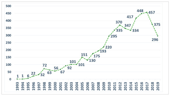 The number of reported documents from the scientific literature amounts to a total of 5118 publications. The works began in 1993, following a pattern of irregular production to date. From 1993 to 1998, the production is ascending and constant, although with a small amount of production. Between 1999 and 2000, there is a decrease in production, rebounding from 2001 to 2005. In this period, the production follows the same pattern as from 1993 to 1998, but with a difference in the amount of production, which is much higher. In 2006, there is a further decline, although from 2007 to 2012, the growth curve is high, with a constant and voluminous production. In 2013 and 2014, there is a further decline, with a rebound in 2015 to 2017. In 2018 and 2019, production falls sharply, bringing the volume of production back to 2010 levels (Figure 2).