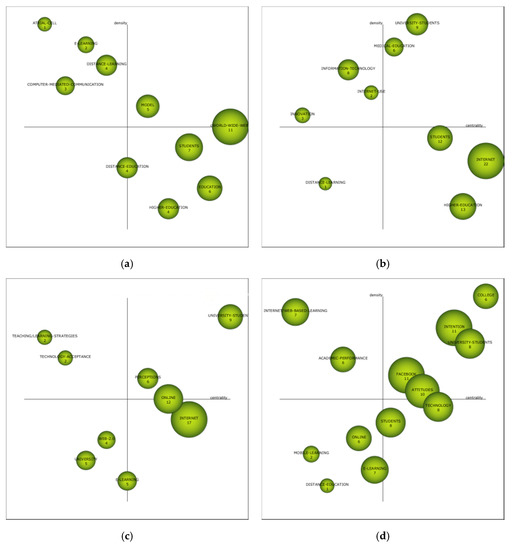 The studies highlighted thus far refer to bibliometric values, but these topics are not the most relevant in each of the periods in our field of research. As can be seen, the most relevant themes do not vary greatly between the periods. The first period focuses mainly on teaching and learning models applied through the use of the Internet. However, from the second period to the present, the most relevant topics are oriented towards the students themselves, associating with their attitudes and technological resources.
