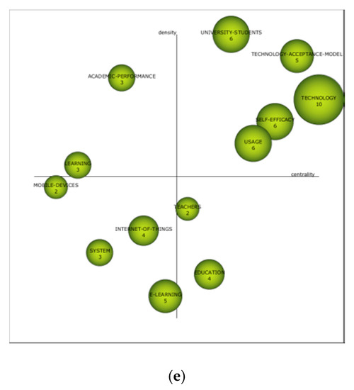 In the last period, in addition to “university-students”, the themes in “technology-acceptance-model”, which deal with “perceived-ease”, “Internet-banking”, “computer-self-efficacy”, “e-learning-systems”, “information-technology”, “behavioural-intention”, “perceived-usefulness” and “used-acceptance” were also leading topics; “technology”, which deals with “internet”, “higher-education”, “acceptance”, “digital-natives”, “environment”, “experience”, “model” and “students”; “self-efficacy”, which deals with “continuance-intention”, “adoption”, “user-satisfaction”, “attitudes”, “beliefs”, “intervention”, “perceptions” and “performance”; “usage”, which deals with “social-media”, “information”, “addiction”, “college-students”, “communication-technologies”, “motivation”, “preservice-teachers” and “university”. In this last period, we must also bear in mind the themes “Internet-of-things”, “systems” and “e-learning”, given that, due to their location in the diagram, they are considered unknown themes, as they may be future driving forces, or may disappear from research. This period follows the line of the previous one, although, in addition to focusing on students, research focuses on learning self-efficacy and social networks (Figure 4).