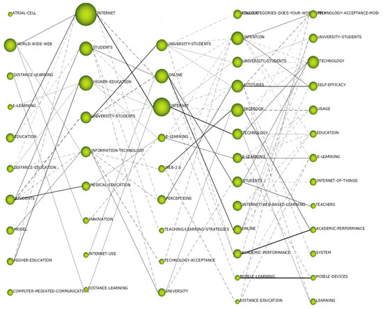 Bearing in mind the data shown in Figure 5, it can be established that a thematic gap exists, given that there is no theme that is repeated in all the established periods. Only “university-education” shows a line of thematic research, but only from the second period onwards; in addition, there are other thematic connections, although they are not constant over time, such as “Internet” in the second and third periods, or “technology” in the fourth and fifth periods. Most of the connections presented in the graph are thematic, since there are more continuous than discontinuous lines. The strongest connections are those that establish “education-Internet-Internet-technology” and “students-students-online-online-technology”.
