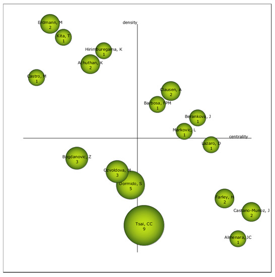 As shown in Figure 6, the most prolific authors throughout the study period were Clausen, A., who works with Tampi, M., and Spanias, A.; Barbosa, F.P.M., who works with Valdez, M.T. and Ferreira, C.M.; Berankova, J., who works with Zerzanova, D., and Cechova, I.; and Markovic, C., who works with Vranes, A. and Mariokov, M.J. In addition, the authors Bogdanovic, Z., and Tsai, C.C., although they are not located in relevant positions in the diagram, are of interest to the scientific community, given their high h-indices. The authors Ozvoldova, M. and Dormido, S. should be kept in mind for the future of LINU, given that their location in the diagram places them as unknown authors, meaning that they may be relevant in the coming years or may tend towards disappearance.