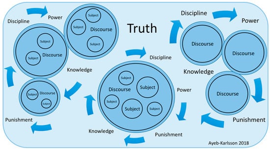 To summarise, knowledge is produced through power that produces new knowledge, that confirms social norms through people’s observations of power relations. The effects of power can in this way be a creative force or imply positive growth. From this point of view, power relations go beyond “the powerful powering the powerless”. Power is not something a social group or institution permanently possesses, but rather something that operates a consistent basis within all social relations, including in between people, or between people and institutions (Foucault 1977, 1982). Power and knowledge in this way help maintain and reproduce people (or subjects) within discourses (see Figure 1)—“power” by socially punishing those who step outside of the social norm, and “knowledge” by disciplining people’s actions and behaviours according to what they know (Foucault 1977, 1982; Butler 2006; Ayeb-Karlsson et al. 2019, 2020).