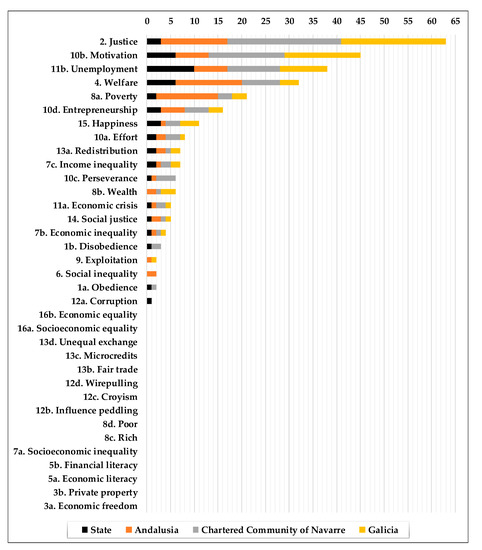 The Chartered Community of Navarre also includes 17 words, but it is the community where they are present most often (n = 88). Justice (24 = 27.27%), motivation (16 = 18.18%), and unemployment (11 = 12.50%) are the main words; of the rest, twelve are mentioned between 4 (4.55%) and 1 (1.14%) times.