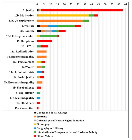 Somewhere in between are Philosophy (44 = 15.49%), and Introduction to Entrepreneurial and Business Activity (41 = 14.44%). In the first case, the predominant word is motivation (37 = 84.09%); in the second, there are two words with similar weight: welfare (13 = 31.71%) and entrepreneurship (12 = 29.27%). The critical and reflexive promotion of motivation should stimulate us to solve problems and achieve major social achievements. On the other hand, it is fundamental to transmit adequately the interrelationship between economic activity and badly needed social welfare. Finally, the entrepreneurial attitudes should be related to psychological, sociological, and management issues in order to stimulate individual and community improvements.