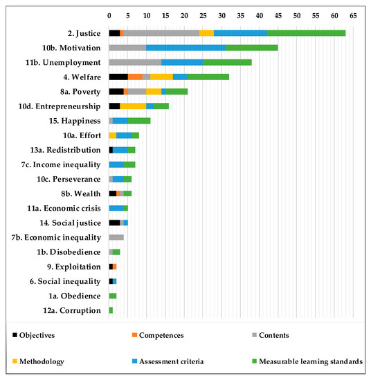 The remaining three curricular elements are specified by the State in Royal Decree 1105/2014 and developed by the Autonomous Communities. These present the most relevant numbers. The contents, or set of knowledge, skills, and attitudes that students should acquire, present 12 keywords (n = 60; 21.13%): justice (20 = 33.33%) and unemployment (14 = 23.33%) stand out. The assessment criteria, that is, what should be valued and achieved, contain 14 keywords (n = 78; 27.46%), predominantly motivation (21 = 26.92%) and justice (14 = 17.95%). Measurable learning standards, i.e., observable, measurable, and evaluable specifications allowing for the grading of achievements, include 16 keywords (n = 92; 32.39%), predominantly justice (21 = 22.83%) and motivation (14 = 15.22%).