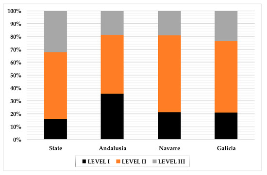 We now respond to Objective 1 and Specific problem 1. The analysis of the four administrative entities reveals certain similarities and differences (Figure 1, Table A1, Table A2, Table A3, Table A4 and Table A5). The most abundant keyword in level III is redistribution (7 = 2.46%), which is found in the four entities with very equal numbers (2–1) and percentages (4.35%–1.32%). In state legislation there are 17 words (n = 46). The most used are unemployment (10 = 21.74%), motivation (6 = 13.04%), and welfare (6 = 13.04%); the rest give unrepresentative figures: between 3 (6.52%) and 1 (2.17%).