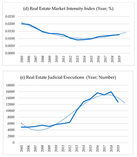 Graphical trend of the macroeconomic regressors (our elaboration on data provided by Italian National Institute of Statistics, Italian Agency of Revenue, Bank of Italy, Astasy, and other private sources): (a) Average Household Income (AHI); (b) Number of Unemployed (UNEMP); (c) Per Capita Income (PI); (d) Real Estate Market Intensity Index (IMI); (e) Number of Real Estate Judicial Executions (JEX). The reference year is always indicated on the x axis. Bold line contains the observed values of variables, dash line represents the trend line.