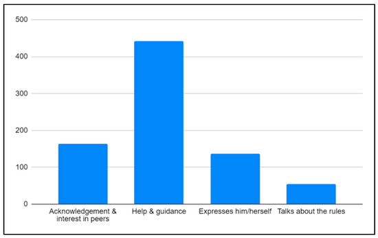 A total of 797 children’s interactions were audible, transcribed, and classified into the corresponding categories. This section is divided according to the four clusters specified in Table 2. As represented in Figure 1, the ‘help and guidance interactions’ category (442/797, 56%) contains the vast majority of the children’s utterances, followed by the ‘acknowledgment and interest in peers’ category (163/797, 20%). The ‘expresses him/herself’ category (137/797, 17%) represents the third most-frequent cluster, followed by those utterances wherein the children recalled the rules of the IG during the activity (55/797, 7%). Extracts of the children’s interactions are included for each cluster and presented in the following sub-sections.