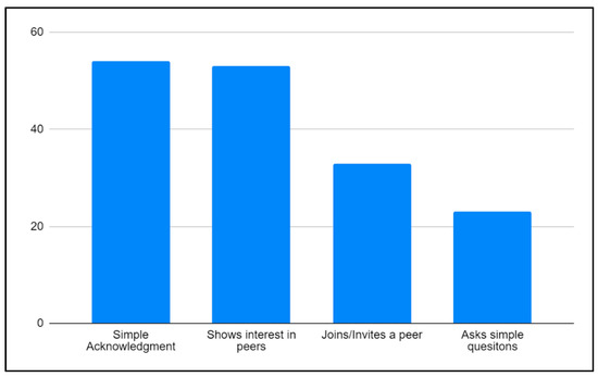 This cluster gathered references from the following categories: ‘simple acknowledgement’ (54/163, 33%), ‘shows interest in peers’ (53/163, 32%), ‘invites or joins a peer’ (33/163, 20%), and ‘asks simple questions’ (23/163, 15%). In other words, when a child provided or received acknowledgment from peers in the IG—for example, supportive interactions or showing pride in a peer—such utterances were classified in this wider cluster, along with interactions reflecting an invitation to a peer to join one’s work. Simple questions were also classified in this dimension, as they show interest in one another’s opinions or experiences. Figure 2 details the categories of positive peer interactions included in this cluster.